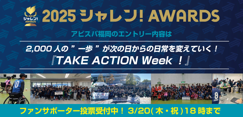 この度、2025シーズンの「2025シャレン!AWARDS」ファン・サポーター選考賞の投票が3月6日(木)よりスタートしました。アビスパ福岡のシャレン!やホームタウン活動を支えるファン・サポーターの皆様の一票が、最も輝いたシャレン活動を決定します。この賞はファン・サポーターの皆様が投票できる貴重なチャンスですので、ぜひアビスパ福岡が取り組むシャレン活動に投票し、共にタイトル獲得を目指しましょう!