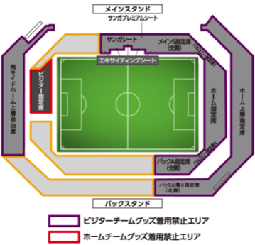 | ビジターチームグッズの持ち込み及び応援不可 | サンガプレミアムシート エキサイティングシート サンガシート メインS指定席(北側) バルコニー指定席1,4 バックA指定席(北側) バック上層A指定席(北側) ホーム指定席(立見可能) ホーム上層指定席 南サイドホーム上層自由席 |
