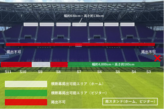 - ホームゴール裏(北側)のみ、内コンコース2階の手すりも掲出可能です。