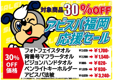 10月26日(日)より、一部対象商品が30%オフの「終盤戦!30周年記念アビスパ福岡応援セール」を開催いたします!!