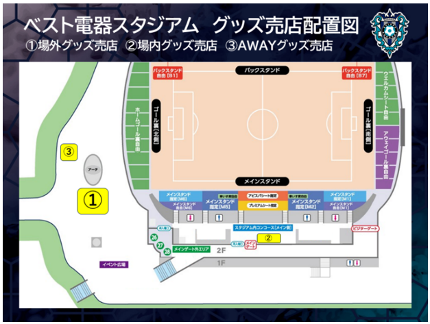 | ②場内グッズ売店 | 10:35~後半キックオフまで ※メインスタンド2Fコンコースグッズ売店では一部お取り扱いのない商品がございます。 |