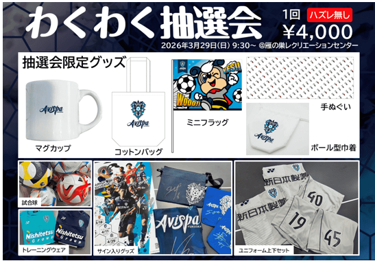 3/29(日)雁の巣レクリエーションセンターでの公開練習日(トレーニングマッチ11:00キックオフ予定 vsヴェルスパ大分)にて、ガラポン抽選会とグッズ販売を実施いたします!
