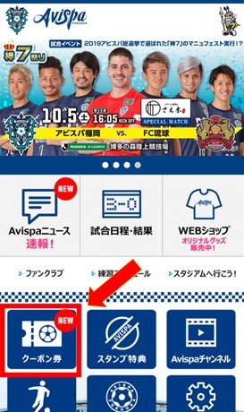 ①「アビスパ福岡公式アプリ」をインストールしていただき、アプリを開いたらクーポン券を選択してください。