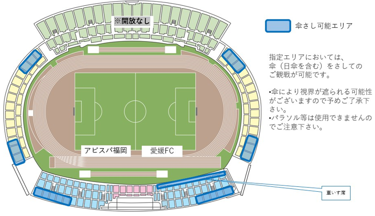 指定エリアにおいては、傘(日傘を含む)をさしてのご観戦が可能です。詳しくは下記の図をご参照下さい。