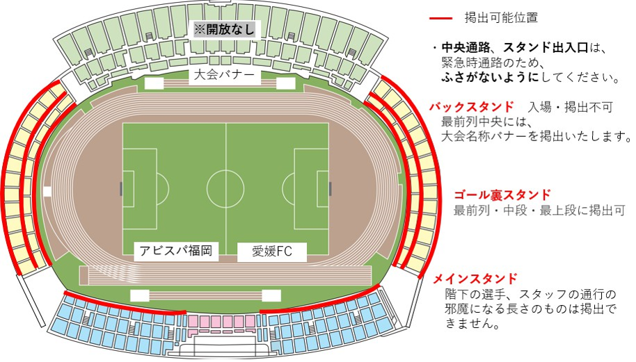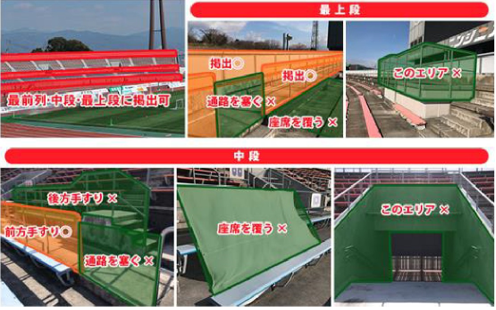 ・中段の掲出可能位置は通路前方の手すりのみ可能。通路後方の手すりは掲出できません(応援横断幕に類似するものを含みます)。