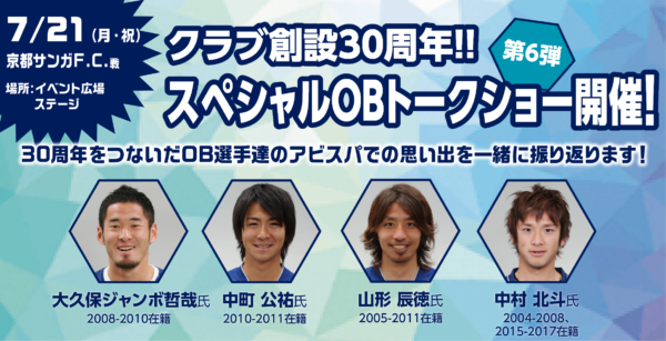 クラブ創設30周年OBスペシャルトークショー第6弾 イベント詳細のお知らせ 7/21(月・祝)京都戦