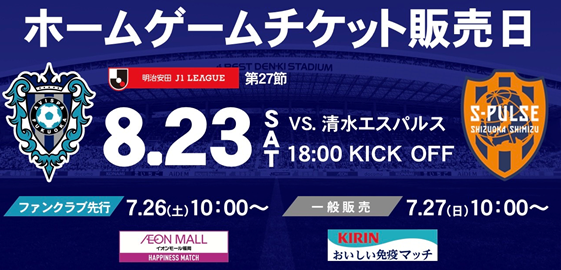 8月23日(土)に開催の明治安田J1リーグ第27節清水エスパルス戦のチケットは、7月26日(土)より販売を開始いたします。夏休み最後の連休は、ぜひベスト電器スタジアムで熱い試合観戦をお楽しみください!