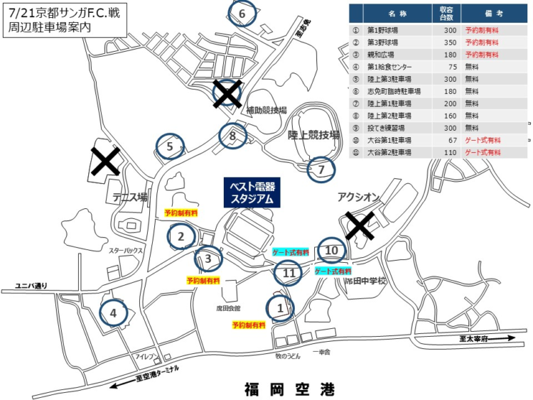 スタジアムがある東平尾公園内の駐車場は限りがあり、一部駐車場が利用できません。
