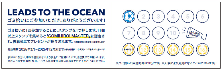 ご参加いただいた方にはスタンプカードをお渡しいたします。ゴミ拾いに1回参加で1スタンプGETできます。スタンプを11個以上集めると、「ゴミ拾いマスター」に認定し、ホーム最終戦においてスタジアム内で表彰を行います。
