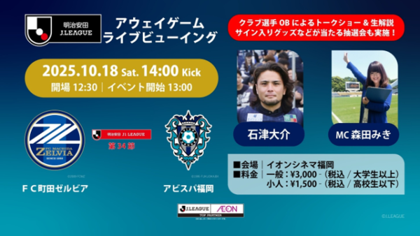 Jリーグトップパートナーであるイオンリテール株式会社は、イオンシネマ福岡にて10月18日(土)に開催される2025明治安田J1リーグ第34節FC町田ゼルビア戦(14:00キックオフ@町田GIONスタジアム)のライブビューイングを開催いたします。
