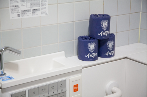 寄贈したネイビー包装トイレットペーパーは、10/4(土)横浜FC戦よりベスト電器スタジアム内トイレに設置されます。