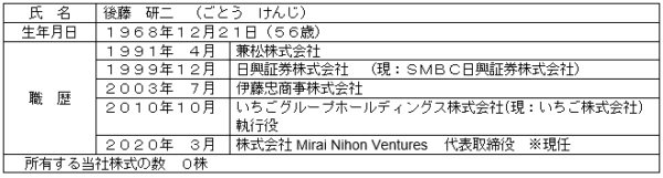 なお、同日開催の臨時取締役会決議により、株式会社Mirai Nihon Venturesの取締役である浅井將雄(あさいまさお)氏に名誉会長に就任いただきました。浅井氏は世界最大規模の債券系ヘッジファンド「キャプラ・インベストメント・マネジメント」の共同創業者で、ロンドンでフットボールサムライアカデミーというアカデミー組織も所有しております。日本代表選手とも親交があり食のサポートもされておられ、海外の人脈も豊富でございます。