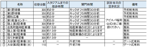 ● 下表の収容台数、スタジアムまでの徒歩時間、開門時間等は目安です。