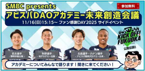 アビスパ福岡は、テレビ西日本で放送中のサッカー応援番組「KICK OFF!FUKUOKA」との共同イベントとして、11月16日(日)に、「SMBC presents アビスパDAOアカデミー未来創造会議」を開催いたします。