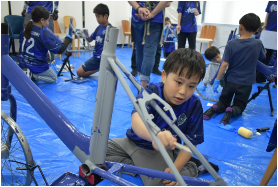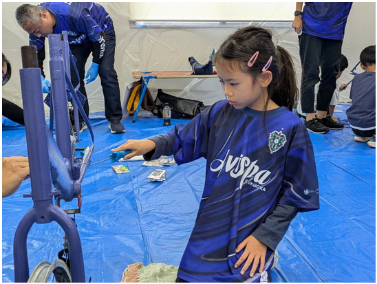 当日は、抽選で選ばれた5組のご家族が参加。古くなったチャリチャリの自転車をアビスパ福岡のチームカラーであるネイビーへの塗装や、思い思いのステッカーやドレスガードにイラストを描くなど、まさに“世界にひとつだけ”のオリジナルチャリに仕上げていただきました。