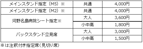 注釈付き指定席(見切り席)・・・メインスタンド指定(M5)、メインスタンド指定(M2)、河野名島病院シート指定