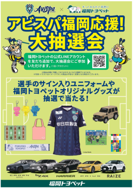 オフィシャル・パートナーとして長年アビスパ福岡に多大なるご支援をいただいております福岡トヨペット様が、恒例となっております大抽選会や募金ブースをホーム最終戦で出展します。また、今回の出展では話題の「ハイエース」と「GRヤリス」の展示が決定しました。皆様のご来場をお待ちしております!