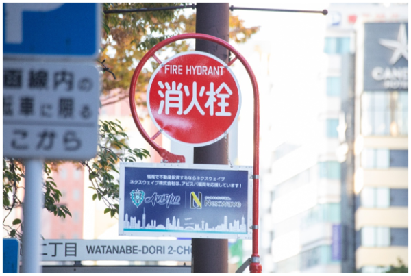 この度、アビスパ福岡とパートナーであるネクスウェイブ株式会社のデザインが入った消火栓標識広告の設置が完了いたしましたので、お知らせいたします。