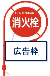 消火栓標識とは、火災の際に速やかに水を供給できるよう、地下にある消火栓の位置を示す標識です。赤いポールの上に「消火栓」と書かれた円形の表示板があり、その下の広告枠による広告収入で民間企業によって維持管理されています。