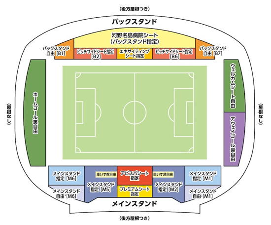 アウェイチームのウエアやグッズ等を身に着けての観戦は、「アウェイゴール裏自由」、メインスタンド指定[M1]、メインスタンド自由[M1]のみでお願いいたします。