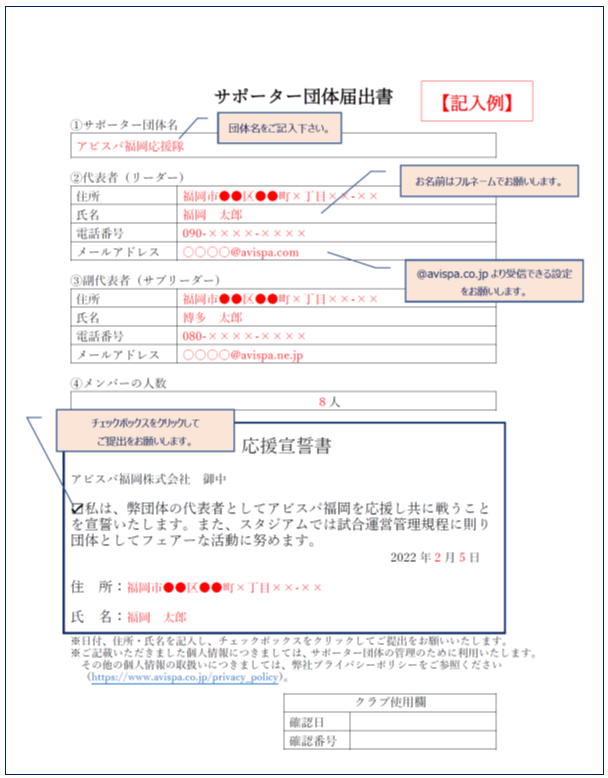 ・アビスパ福岡公式ホームページに、届け出済みサポーター団体として「団体名」を掲載させていた だきます。
