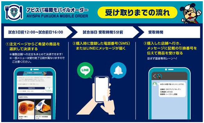 モバイルオーダーは、試合前日までにスマートフォンから事前注文・事前決済ができ、試合当日は各店舗の専用レーンで商品を受け取るサービスです。