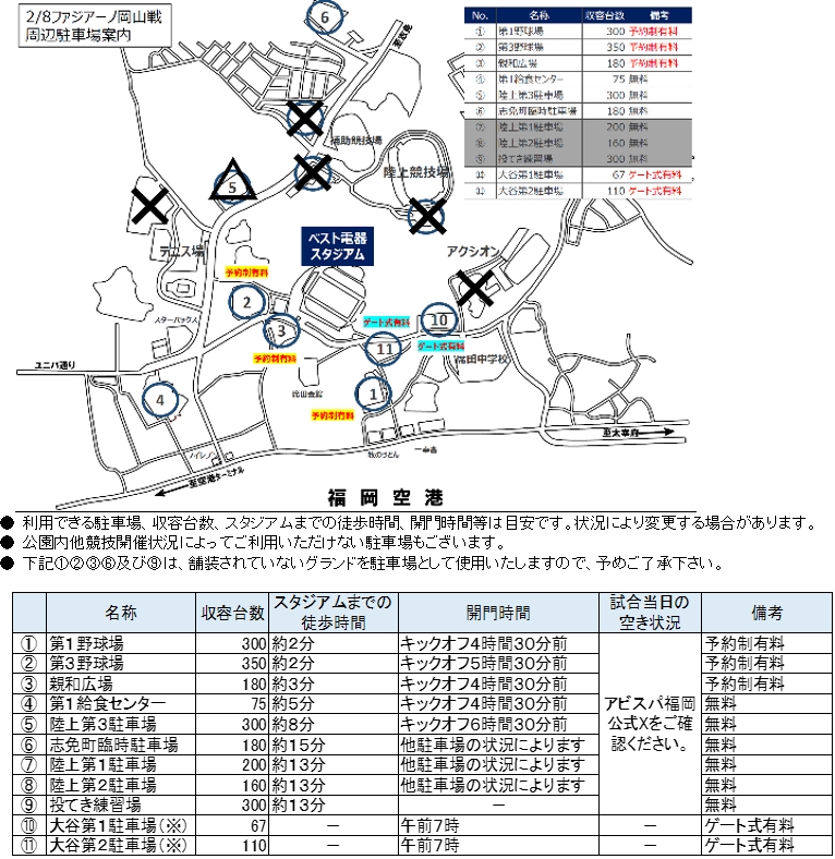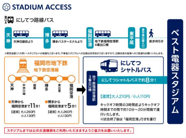 また、ベスト電器スタジアムがある東平尾公園内では、他の競技も開催されご利用いただける駐車場もかなり限定的で、周辺道路および駐車場は非常に混雑することが予想され、キックオフ時間に間に合わない可能性もございます。ご来場の際には、自家用車の使用はお控えいただき、地下鉄、シャトルバス等の公共交通機関のご利用をお願いいたします。