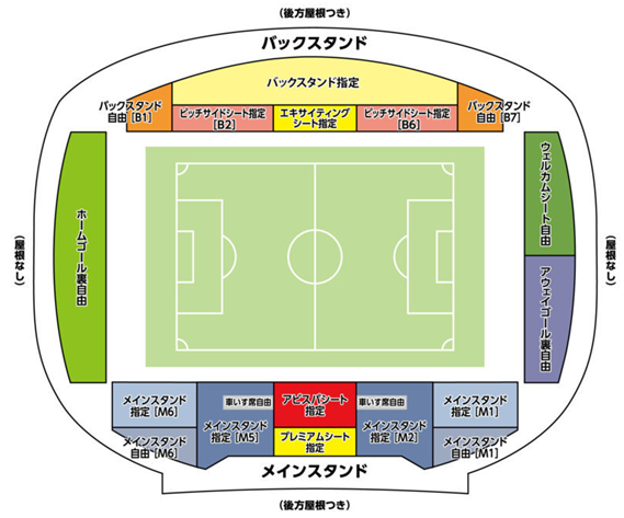 「アウェイゴール裏自由」、メインスタンド指定[M1]、メインスタンド自由[M1]のみです。