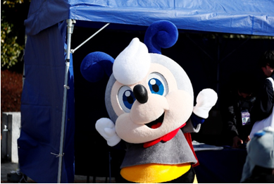 スタジアムのバックスタンドを背景に、スビーくんとの記念撮影!