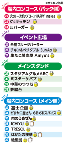 4月11日(土)明治安田J1百年構想リーグ 第10節 V・ファーレン戦(14:00キックオフ/ベスト電器スタジアム)の出店店舗はこちら