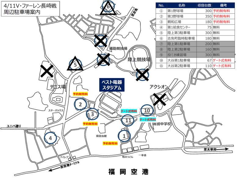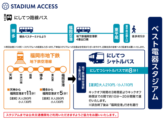 また、ベスト電器スタジアムがある東平尾公園内では他の競技も開催され、ご利用いただける駐車場もかなり限定的で、周辺道路および駐車場は非常に混雑することが予想され、キックオフ時間に間に合わない可能性もございます。ご来場の際には、自家用車の使用はお控えいただき、地下鉄、シャトルバス等の公共交通機関のご利用をお願いいたします。