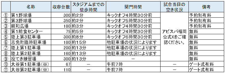 ● 利用できる駐車場、収容台数、スタジアムまでの徒歩時間、開門時間等は目安です。状況により変更する場合があります。