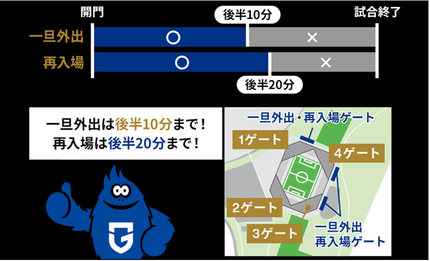後半10分までの一旦外出と、後半20分までの再入場を可とさせていただきます。