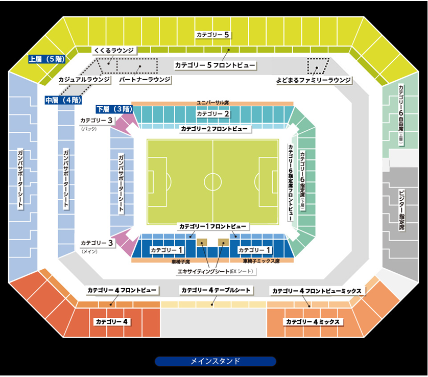 2. ・ガンバ大阪および当該の対戦相手クラブ以外の全Jリーグクラブのユニフォーム(移籍選手の旧クラブユニ含む)および応援グッズの着用はご遠慮ください。またビジター指定席、カテゴリー4ミックス、カテゴリー4フロントビューミックス席以外は、ホームエリアとなり、ビジターチームの応援、ユニフォーム・グッズを着用・使用してのご観戦は出来ません。