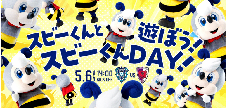 5/6(水・休)京都戦(14:00キックオフ/ベスト電器スタジアム)は、GWは親子でスタジアムへ!「スビーくんデー!」として様々なイベントをご用意しております。