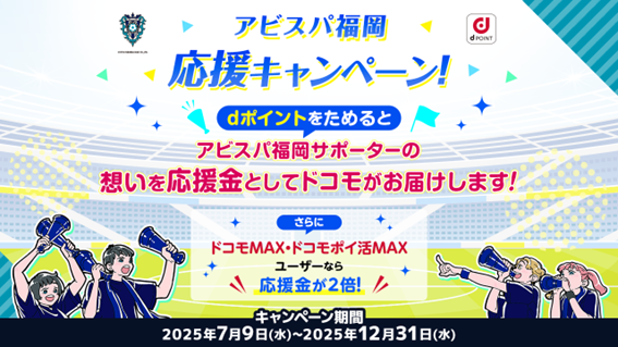 アビスパ福岡のデザインにきせかえてdポイントをためると、キャンペーン期間中にたまった dポイントの 5%の金額がアビスパ福岡に応援金として届けられ※、クラブの運営費や強化費として役立てられます。